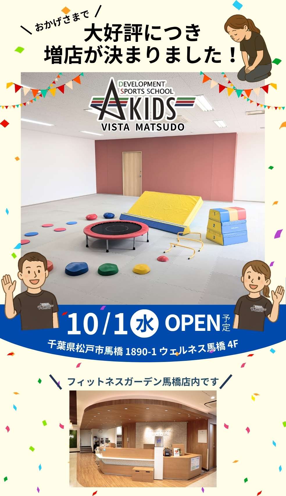 〒271-0051 千葉県松戸市馬橋1890−1 ウェルネス馬橋 4階(フィットネスガーデン馬橋店内)